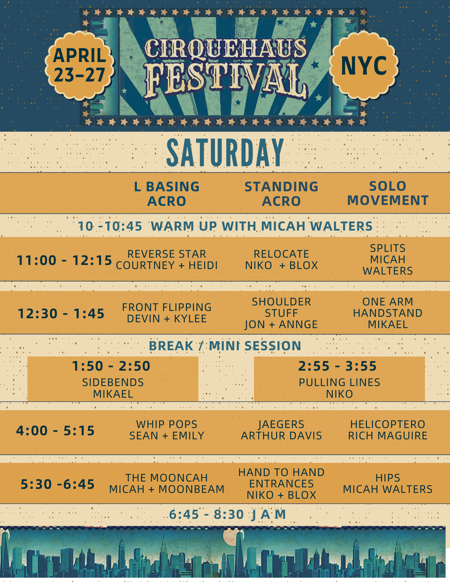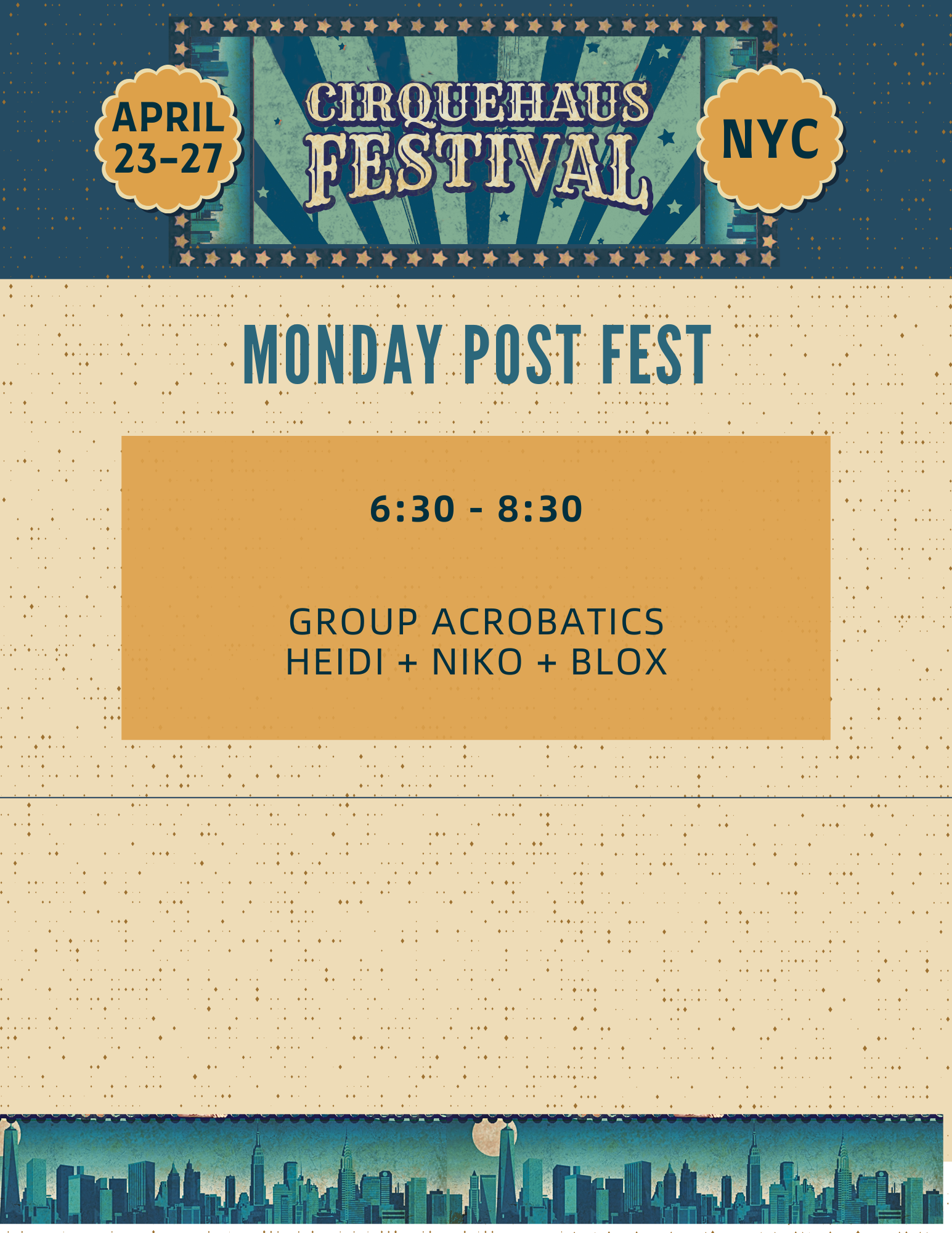 The CirqueHaus Festival is a one of a kind acro and movement festival in NYC featuring expert teachers sharing their knowledge on partner acrobatics, handstand, flexibility and more! This festival will feature pre-fest intensives, an evening circus showcase and 20+ main festival classes.
